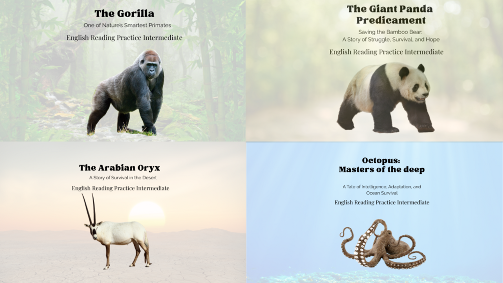 Each lesson focuses on a different creature—Octopus, Gorilla, Oryx, and Panda—and blends storytelling with practical language practice. Whether you're teaching in a classroom or learning yourself online, these lessons spark curiosity and conversation while reinforcing key ESL skills.
