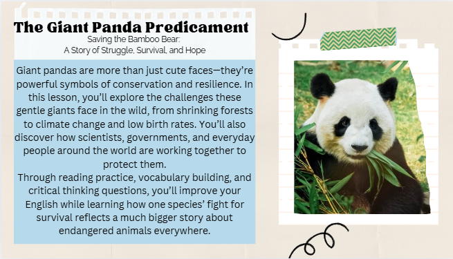 This intermediate-level ESL course blends reading practice, vocabulary building, and critical thinking through the lens of wildlife conservation. Learners will discover the challenges pandas face in the wild, from habitat loss and bamboo dependence to low birth rates and climate change. Through engaging texts, simplified explanations, and reflective questions, students will strengthen their reading comprehension and expand their vocabulary with real-world context.